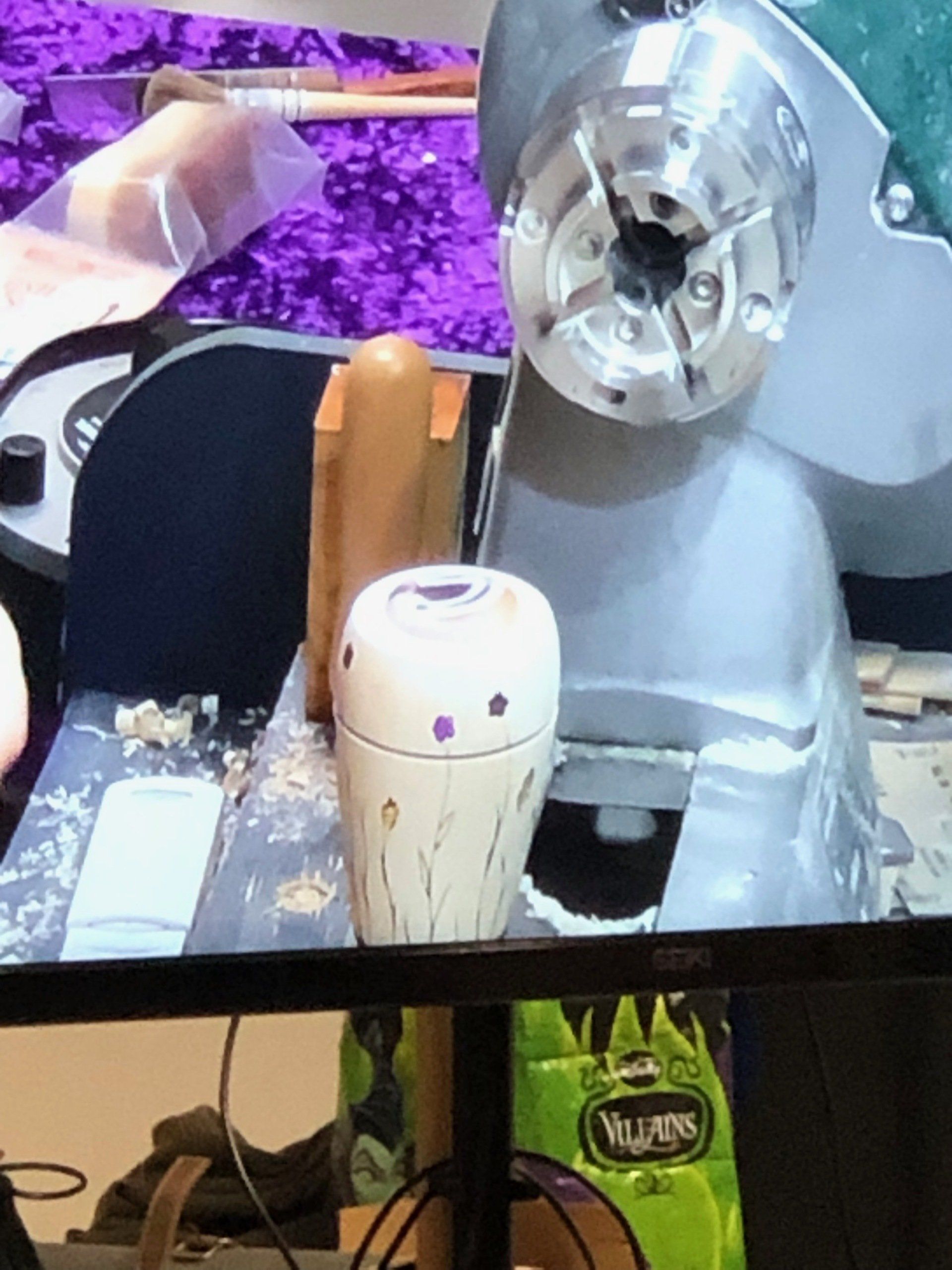 Many members will not be aware of copying lathes, let alone afford to buy one! Margaret introduced us to the therming technique which allows turners the ability to spindle turn identical pieces of work without needing a copying lathe. It involves creating the jig shown opposite and mounting four identically sized blanks as shown in the image opposite in the jig. After turning one face, each of the blanks are repositioned in the jig so that the remaining 3 blanks can be turned. The turner will then have 4 identical pieces of work ready to finish. This method is great for wheel spokes. little boxes, small vases, etc., the list is endless.